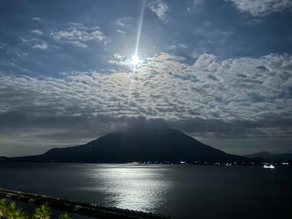 月光に浮かび上がる桜島、インフィニティラウンジにて
