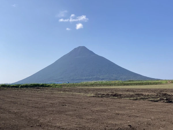 火山灰由来の”黒ボク土”ごしに見る迫力の開聞岳
